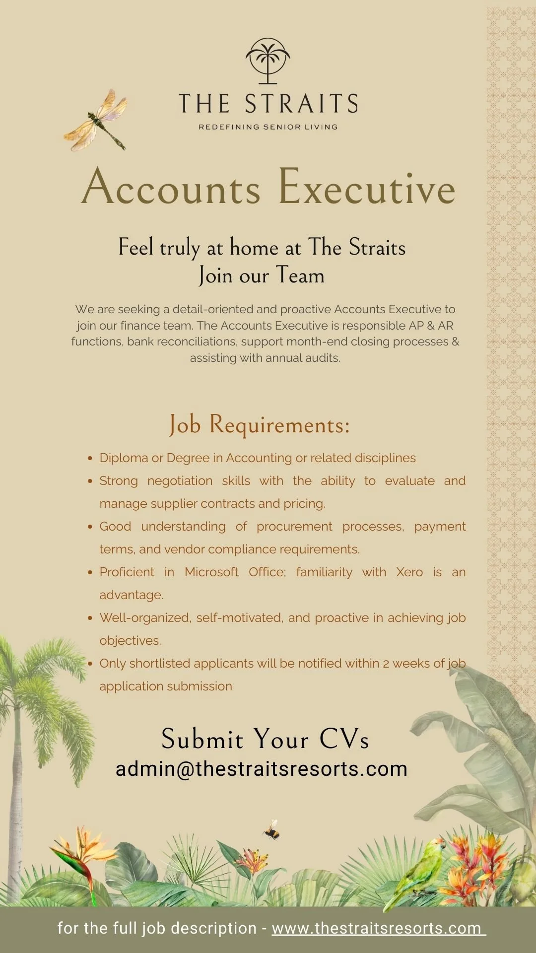 The Accounts Executive plays an essential role in supporting and strengthening the daily finance operations at The Straits. This position oversees key responsibilities including managing accounts payable and receivable, preparing and reviewing bank reconciliations, and assisting with month‑end closing activities to ensure accurate and timely financial reporting. The role also supports the annual audit process by organizing documentation and coordinating with auditors.